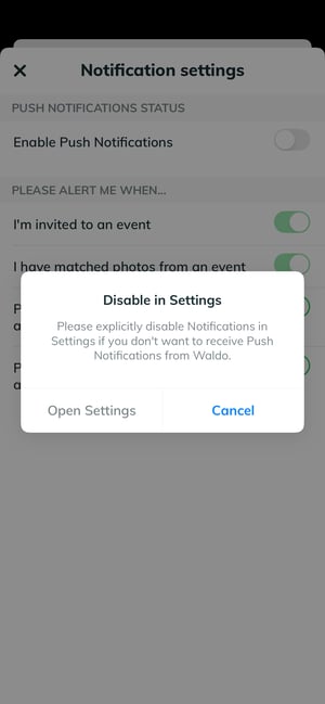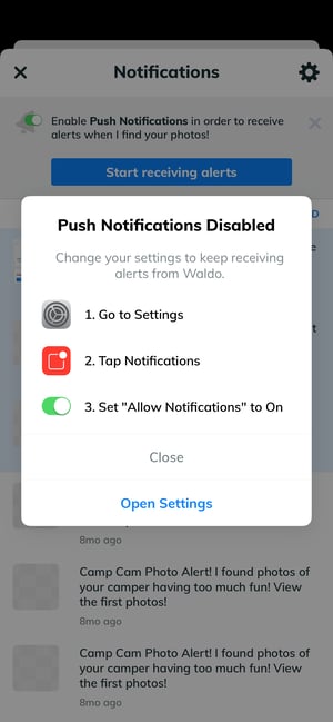 - Click View Notifications. If you have Text Message notification enabled, you'll see information at the top of the screen that says Enable Push Notifications in order to receive alerts when I find your photos! If you click on the blue button that says Start receiving alerts, you will see a pop-up menu that says Waldo Would Like to Send You Notifications the first time that you switch from Text Messages to Push Notifications. Once you click on Allow, you will receive Push Notifications instead of Text Message notifications.