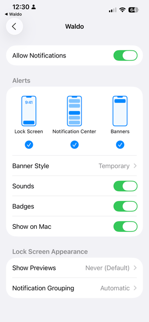 - If you are currently receiving Push Notifications and would prefer to receive Text Message notifications instead, please exit the Waldo app and navigate to your phone's device Settings, scroll to Notifications, and click on it, then scroll down to Notification Style until you see the Waldo logo face.