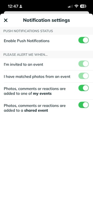 - If you toggle on Push Notifications you will see options appear to set the Alert and Banner style for your notifications. Please note that if you enable Push Notifications, then turn off Alerts you will not receive notifications for matched photo delivery. To fix this, select your Alert style or switch back to Text Message notification (see #5 for more info) to receive notifications as matches are found.